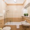 Il bagno privato con antibagno è provvisto di vasca da bagno con doccino, lavabo e bidet. Nell’antibagno troverete la lavatrice, il ferro e l’asse da stiro per poter rinfrescare i vostri abiti in caso di lunghi soggiorni.