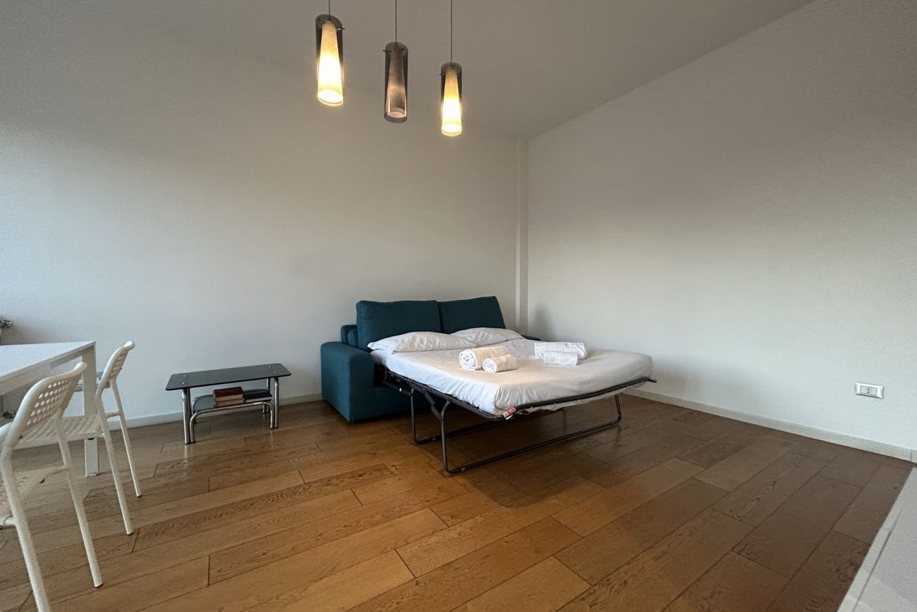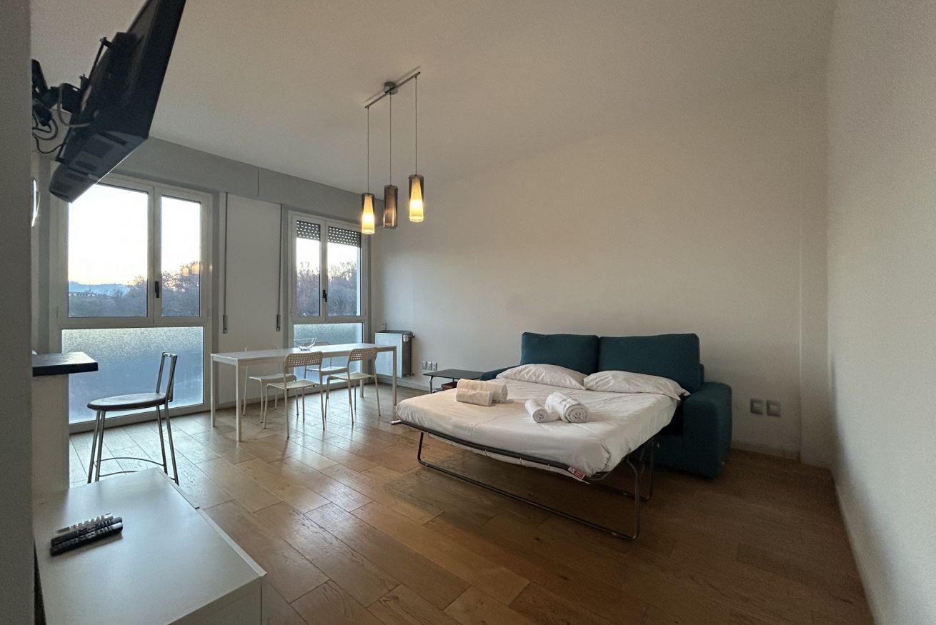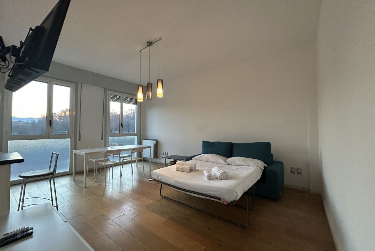 Il soggiorno è completato da un divano letto matrimoniale e una grande smart TV con accesso a Netflix, Prime Video e Disney Plus, per momenti di puro relax.