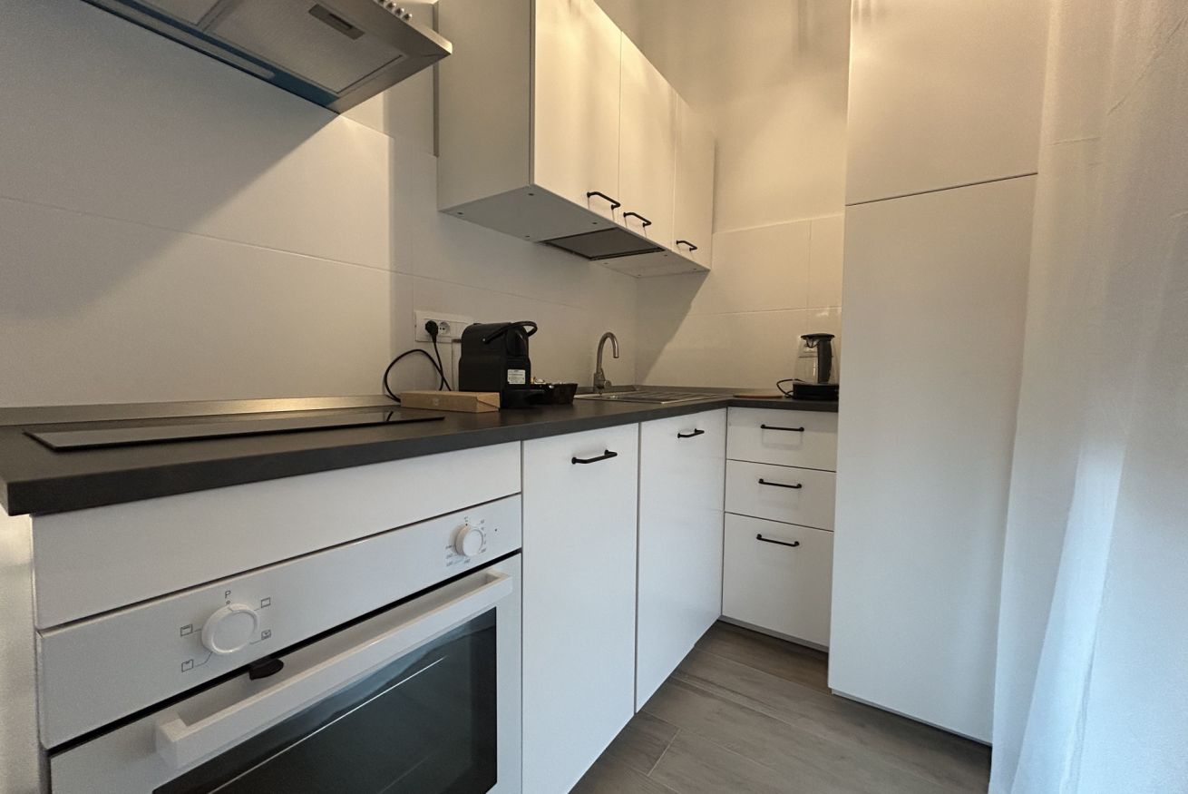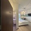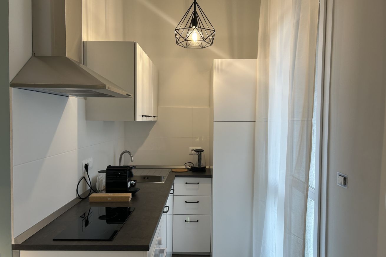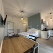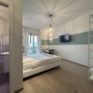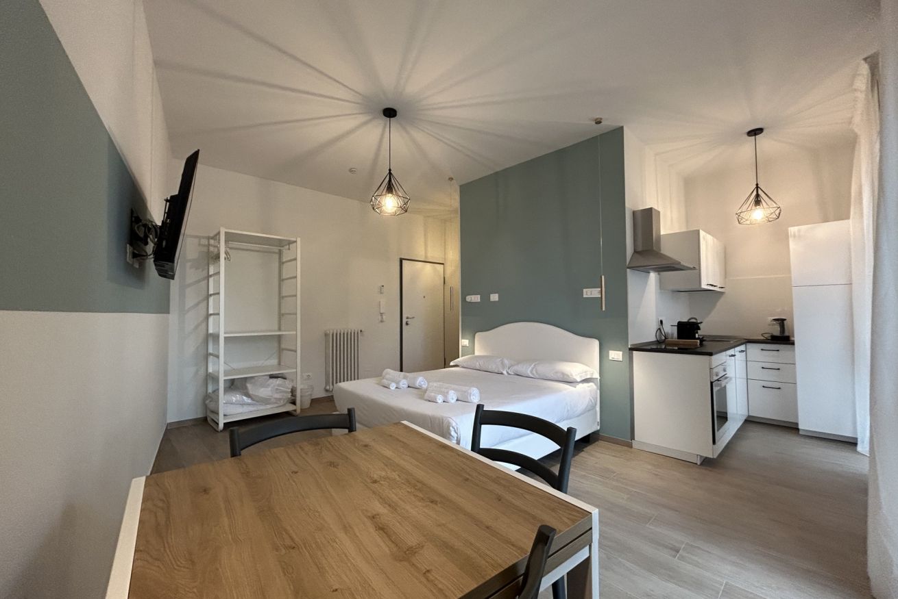 All’interno, il monolocale è pensato per massimizzare lo spazio: c’è un comodo letto queen size (160x190 cm) e una cucina completamente attrezzata con piano cottura, forno, microonde, lavastoviglie, frigorifero e macchina del caffè. Il tavolo da pranzo ha due posti a sedere, perfetti per una colazione veloce o una cena intima.